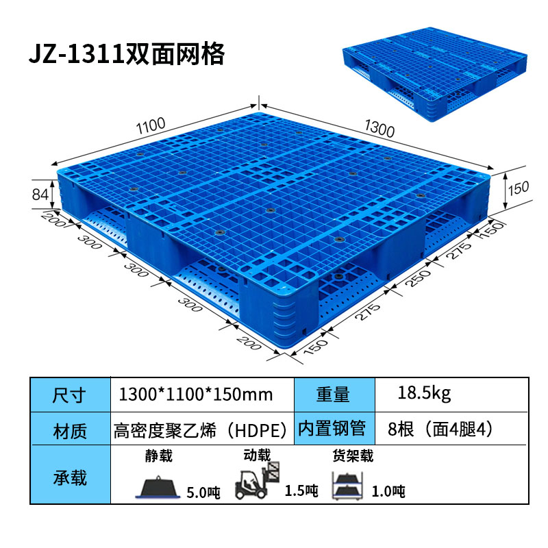 雙面網(wǎng)格塑料托盤其特點(diǎn)是正反兩面的結(jié)構(gòu)相同,均為網(wǎng)格狀,因此兩面都可以使用,故被稱為雙面網(wǎng)格塑料托盤。這種托盤通常應(yīng)用于食品廠、化工廠、化肥制造、冷庫等行業(yè)。雙面網(wǎng)格塑料托盤的插孔較低,因此不適合使用地牛拖車,在選擇使用時(shí)需要特別注意。根據(jù)成型工藝的不同,雙面網(wǎng)格塑料托盤可以分為一體成型雙面網(wǎng)格和焊接雙面網(wǎng)格托盤兩種類型。